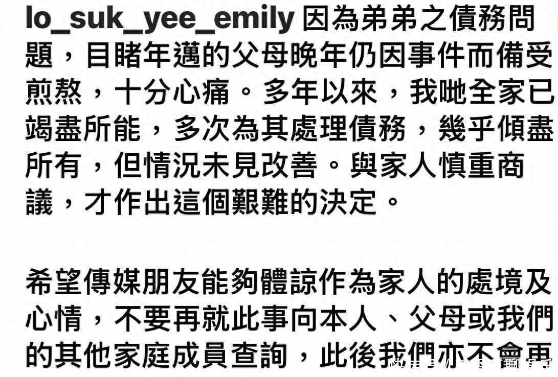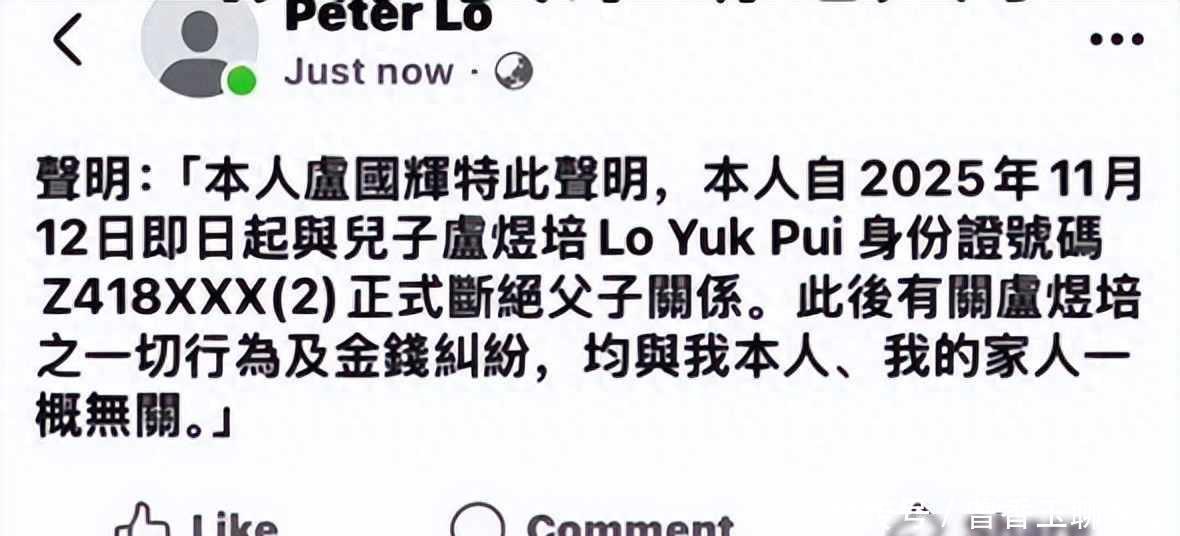 2025年11月12日,卢国辉发表声明,宣布与儿子卢煜培解除父子关系,他公开了卢煜培的身份证号码,这种做法比较少见,一般家庭矛盾会私下处理,他却选择对外划清界限,女儿卢淑仪是李克勤的妻子,她也转发了这份声明,并首次透露,多年来全家人为帮助卢煜培偿还债务,几乎用光了家中积蓄。